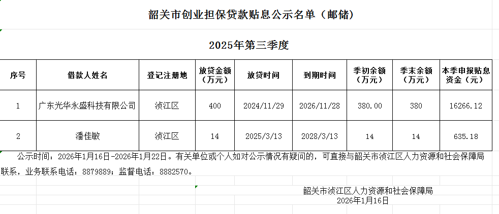 韶关市创业担保贷款贴息(邮储)
